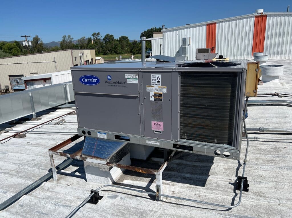 Installation of a new Carrier roof top unit (RTU) for this commercial client. The previous unit had finally work out. This new system required some metal fabrication amd duct work modifications but client and employees at the business will have proper heating and cooling!