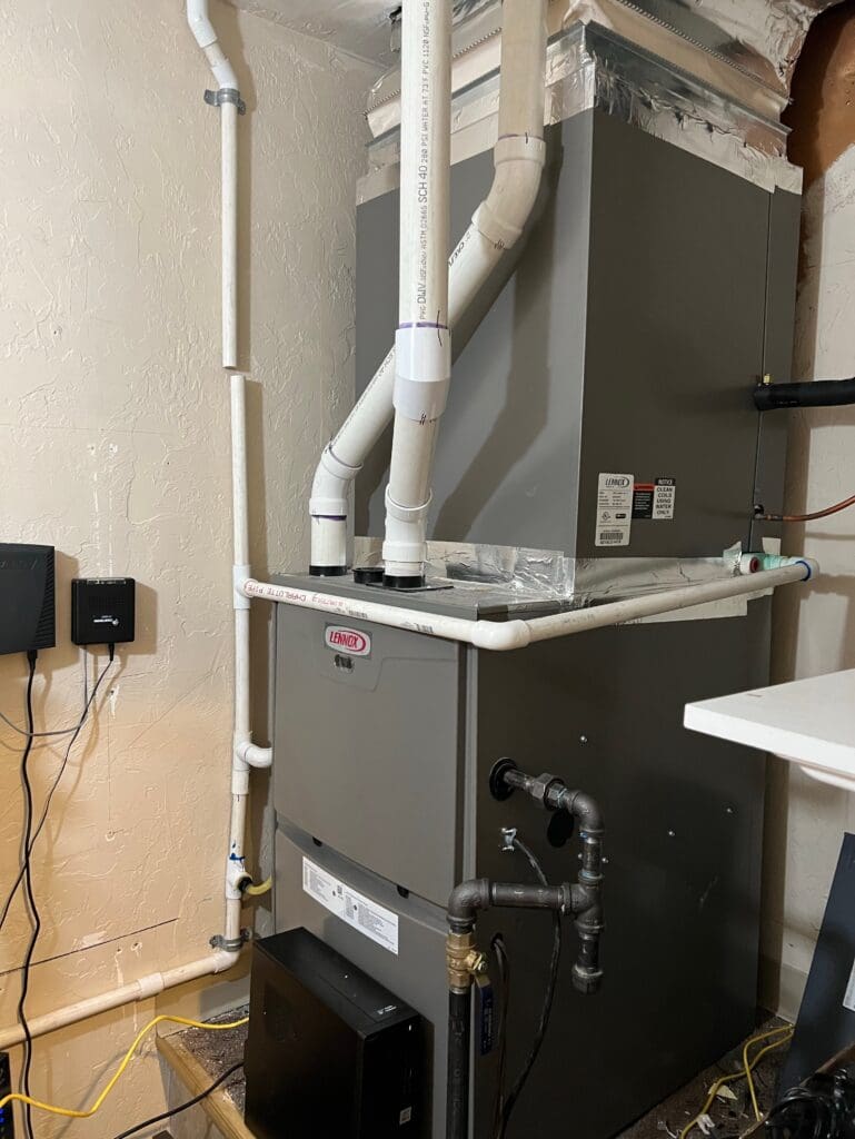 Installation of new Carrier Performance series gas furnace with an addition being built and the rest of the being remodeled. new system will be zoned providing comfort at levels the homeowner wants in different rooms. Just need to finish drains, line set, and wait for remaining construction to finish.